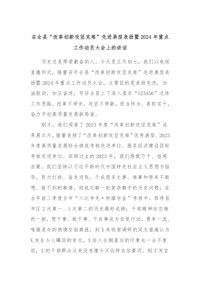/ 在全县“改革创新攻坚克难”先进典型表扬暨2024年重点工作动员大会上的讲话稿
