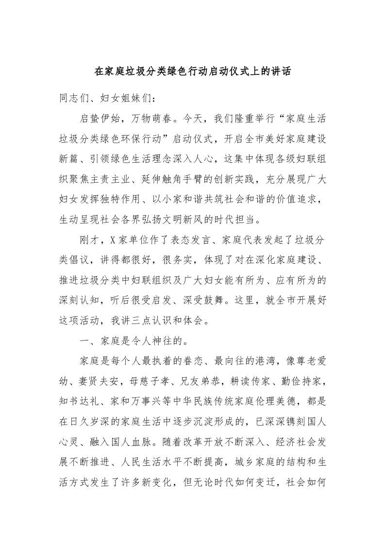 / 在家庭垃圾分类绿色行动启动仪式上的讲话稿