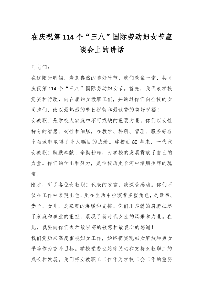 / 在庆祝第114个“三八”国际劳动妇女节座谈会上的讲话稿