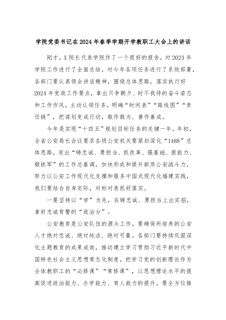 / 学院党委书记在2024年春季学期开学教职工大会上的讲话稿