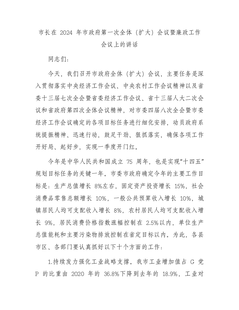 市长在2024年市政府第一次全体(扩大)会议暨廉政工作会议上的讲话