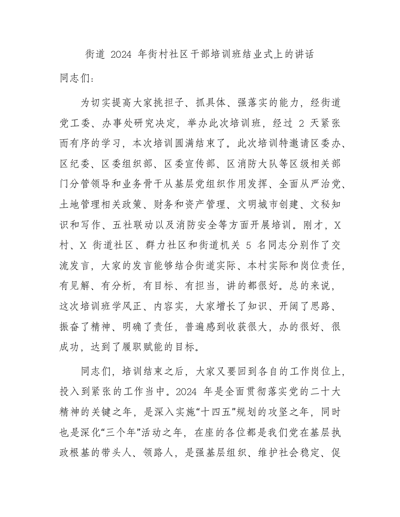 / 街道2024年街村社区干部培训班结业式上的讲话