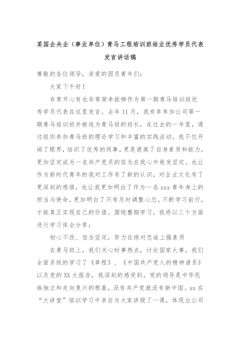 / 某国企央企(事业单位)青马工程培训班结业优秀学员代表发言稿讲话稿稿