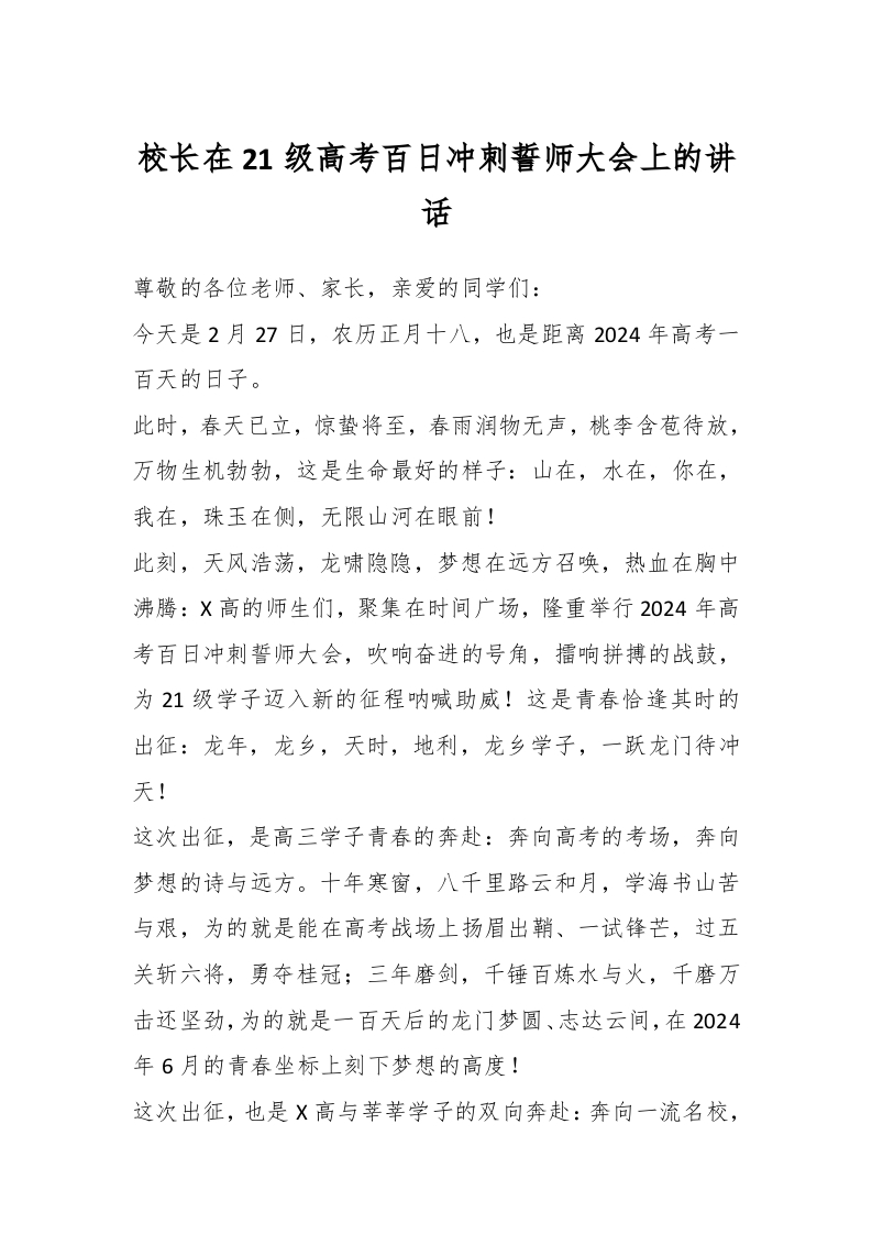 / 校长在21级高考百日冲刺誓师大会上的讲话稿