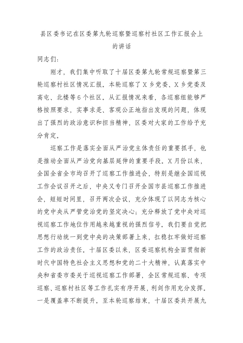 / 县区委书记在区委第九轮巡察暨巡察村社区工作汇报会上的讲话