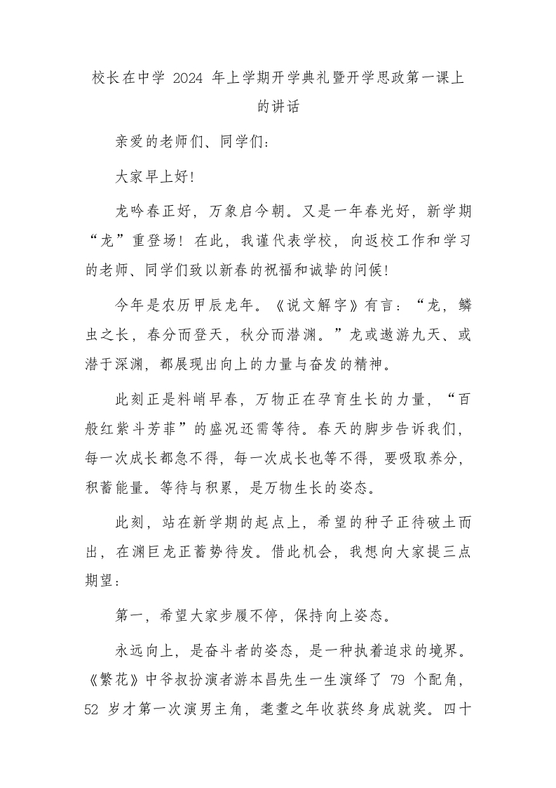 / 校长在中学2024年上学期开学典礼暨开学思政第一课上的讲话(学校)