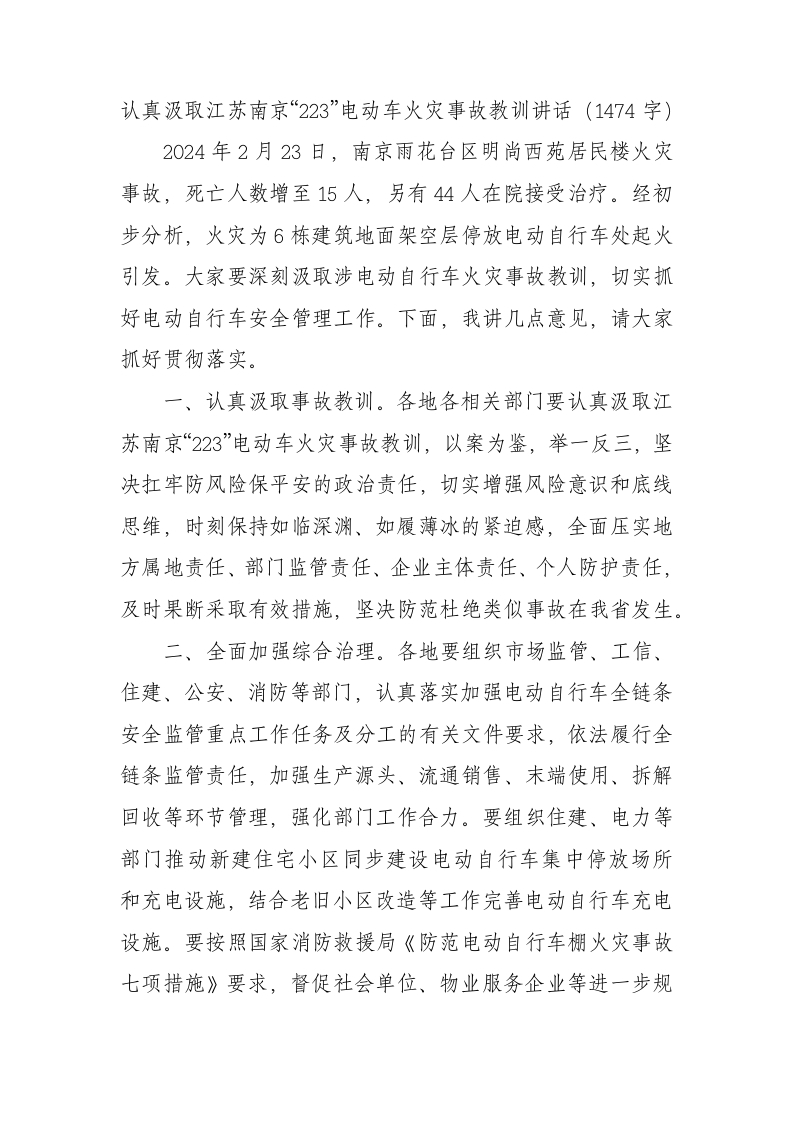 / 认真汲取江苏南京“2·23”电动车火灾事故教训讲话