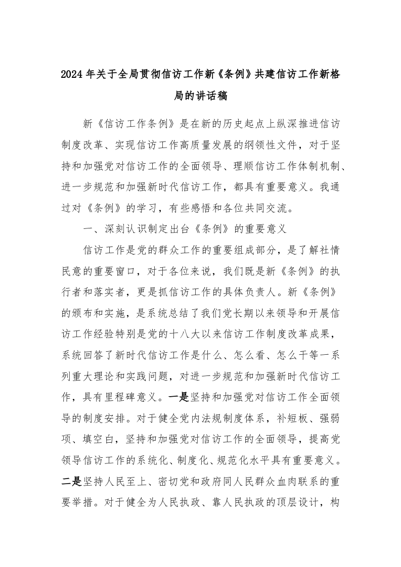 2024年关于全局贯彻信访工作新《条例》共建信访工作新格局的讲话稿稿