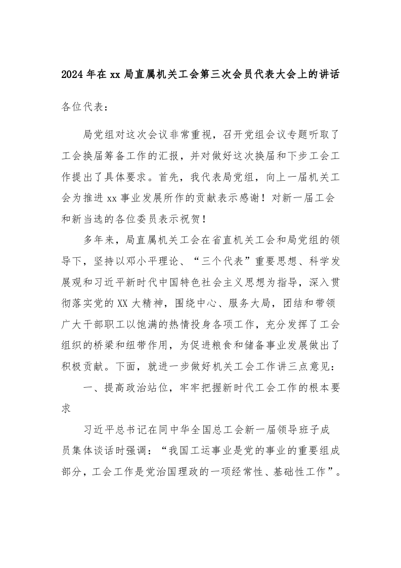 / 2024年在xx局直属机关工会第三次会员代表大会上的讲话稿