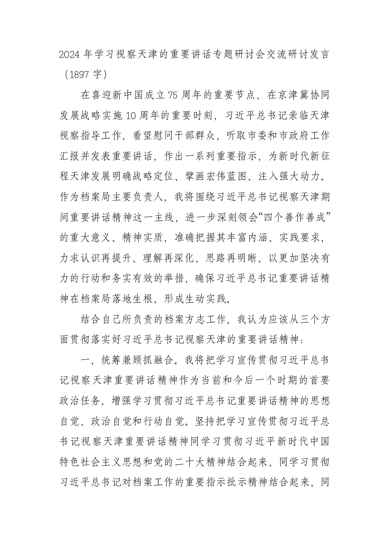 2024年学习视察天津的重要讲话专题研讨会交流研讨发言