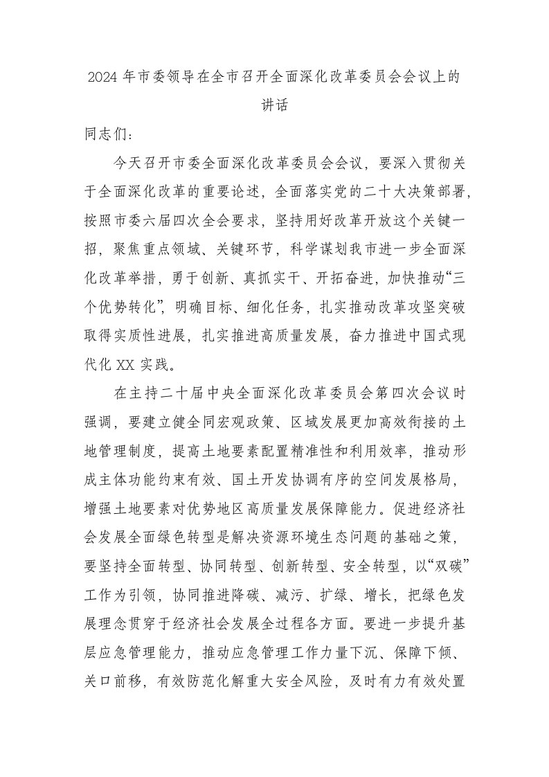 / 2024年市委领导在全市召开全面深化改革委员会会议上的讲话