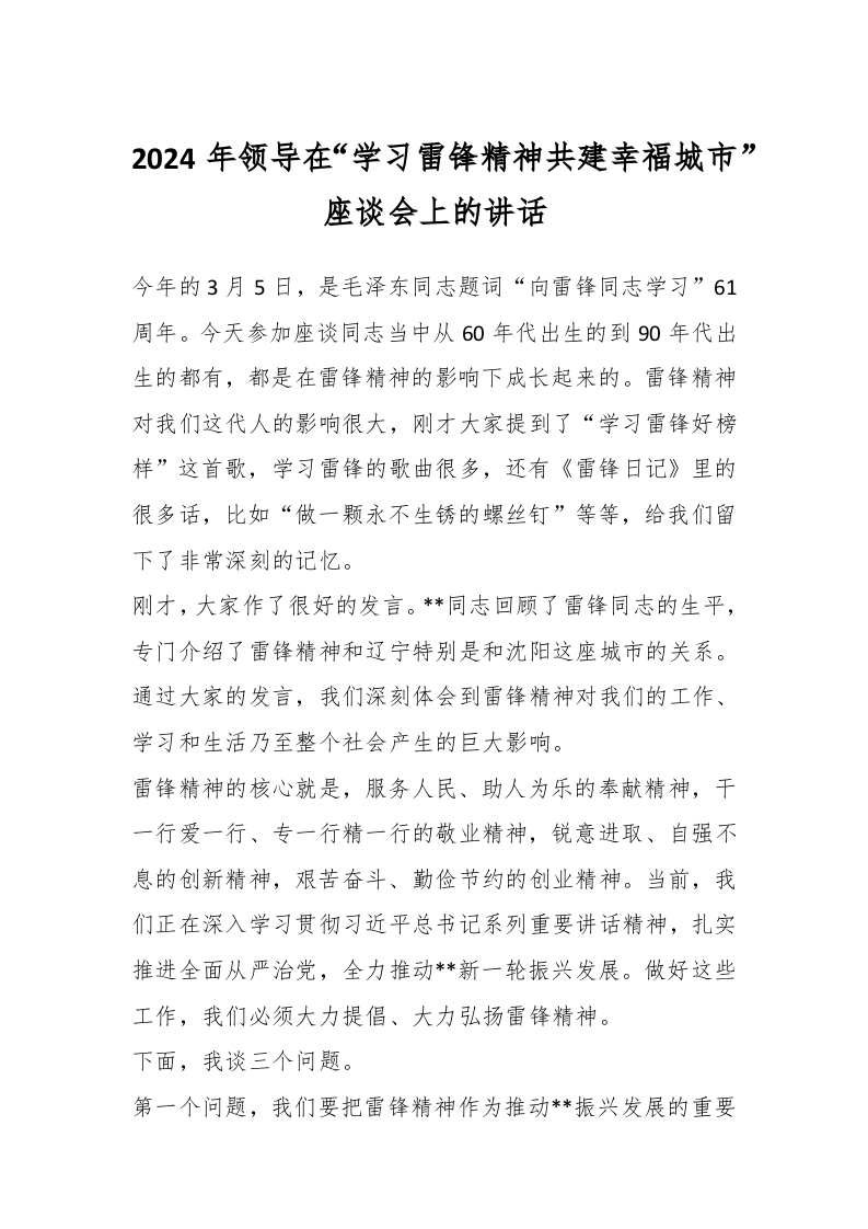 / 2024年领导在“学习雷锋精神共建幸福城市”座谈会上的讲话稿