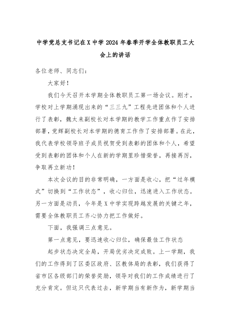 / 中学党总支书记在X中学2024年春季开学全体教职员工大会上的讲话稿
