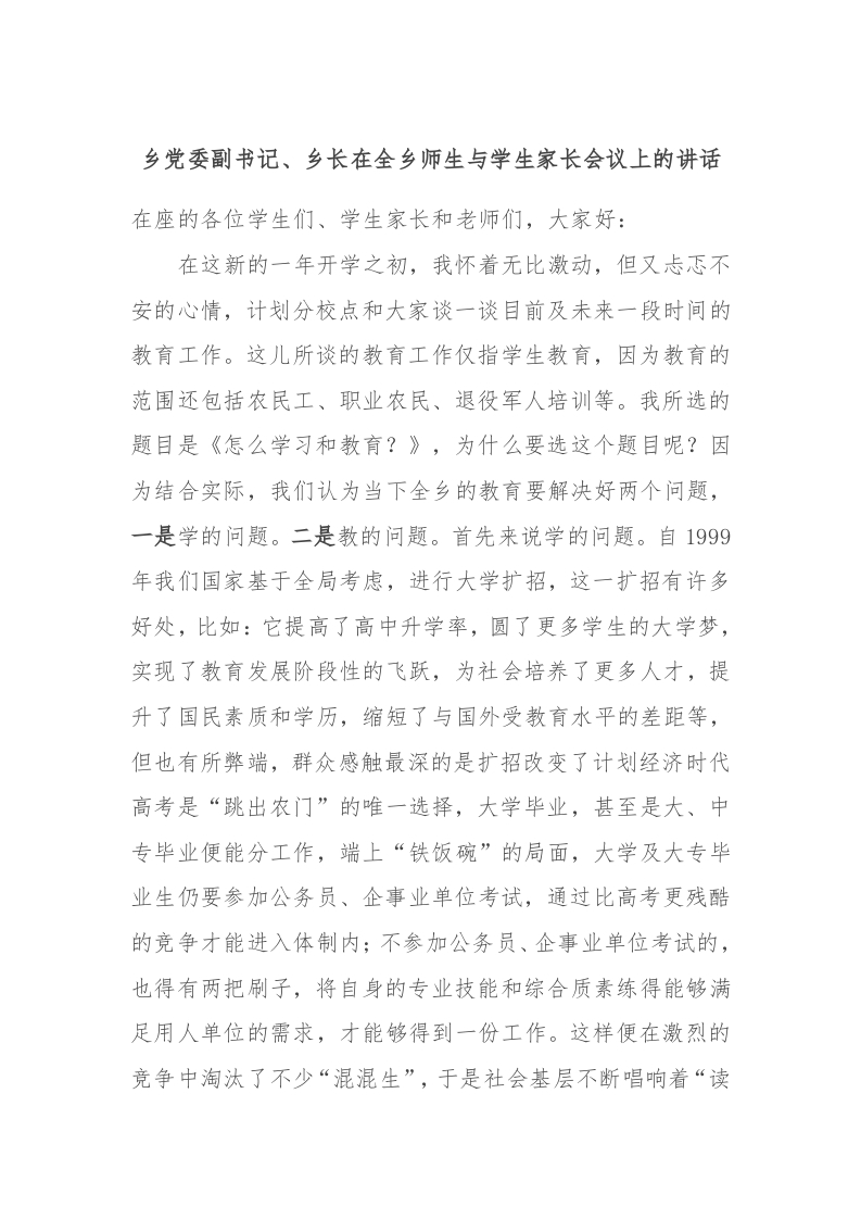 / 乡党委副书记、乡长在全乡师生与学生家长会议上的讲话稿