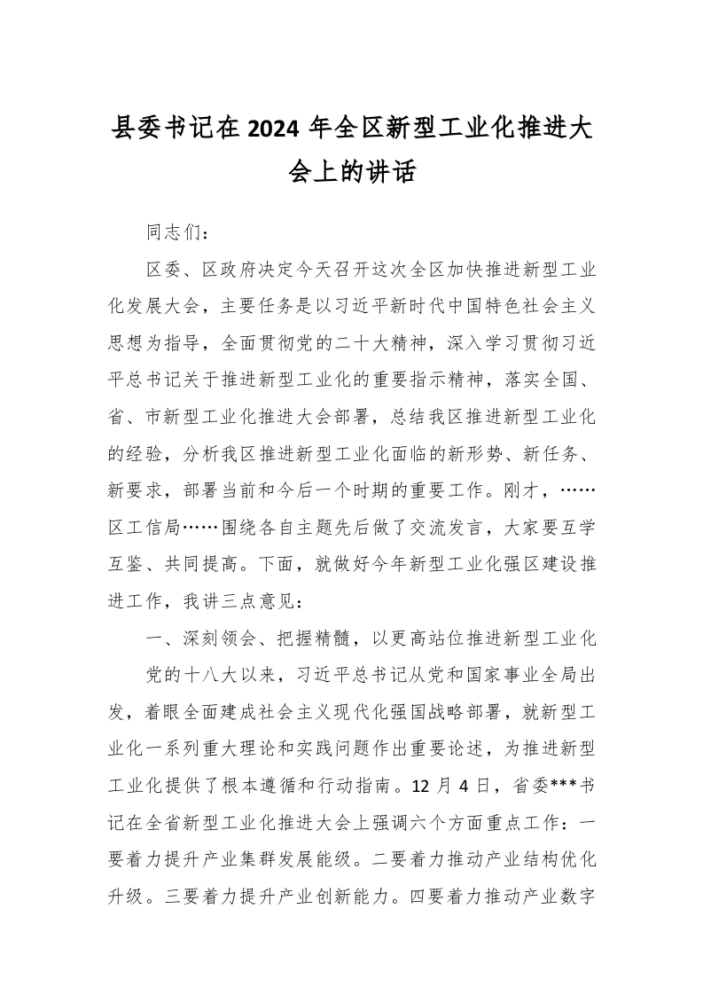 / 县委书记在2024年全区新型工业化推进大会上的讲话稿