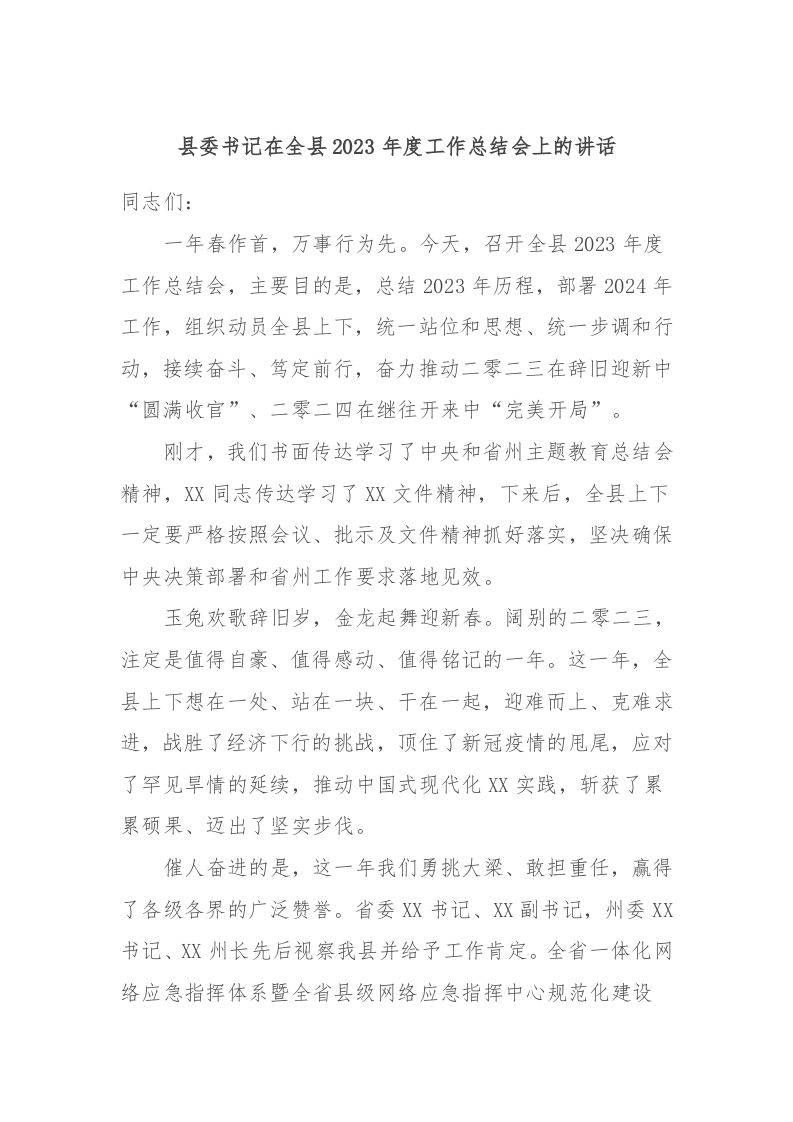 / 县委书记在全县2023年度工作总结会上的讲话稿