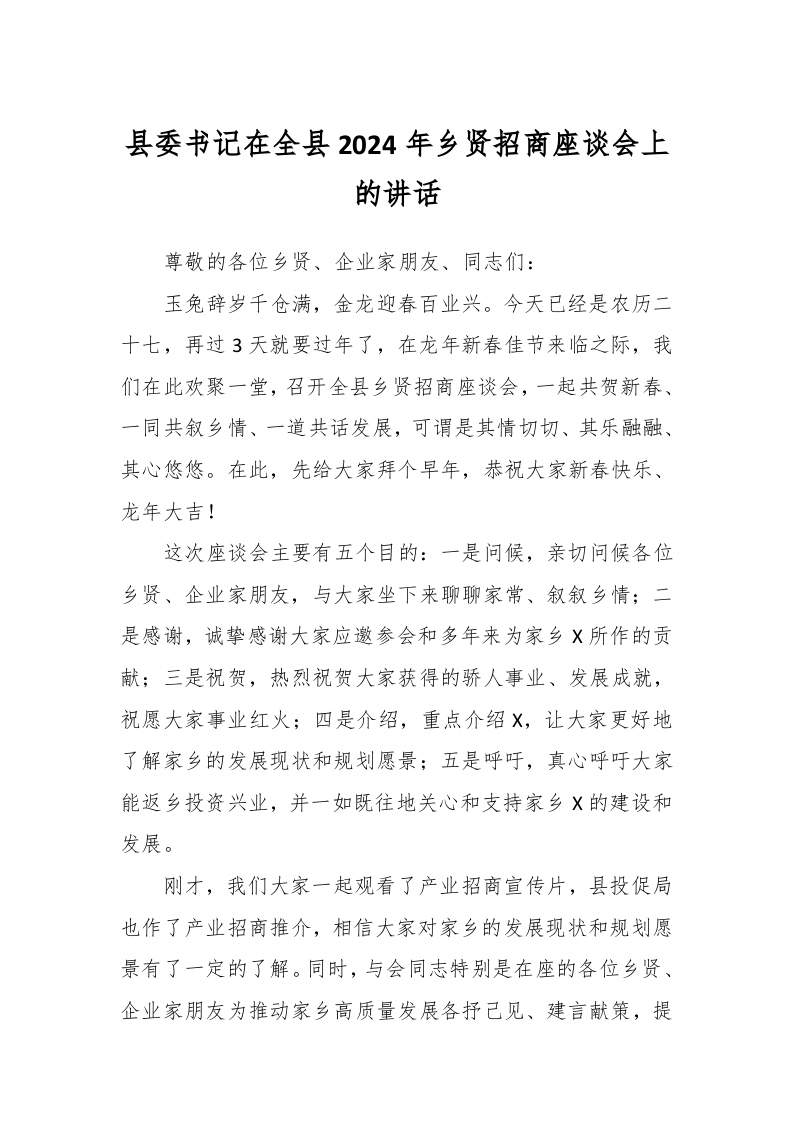 / 县委书记在全县2024年乡贤招商座谈会上的讲话稿