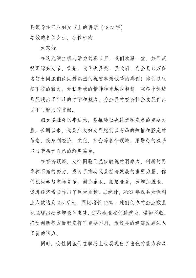 / 县领导在三八妇女节上的讲话