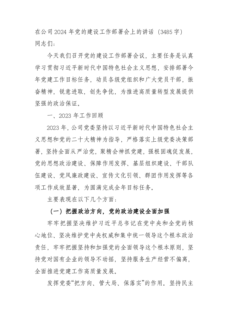 国企2024年党的建设工作部署会上的讲话