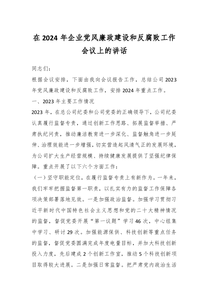 / 在2024年企业党风廉政建设和反腐败工作会议上的讲话稿