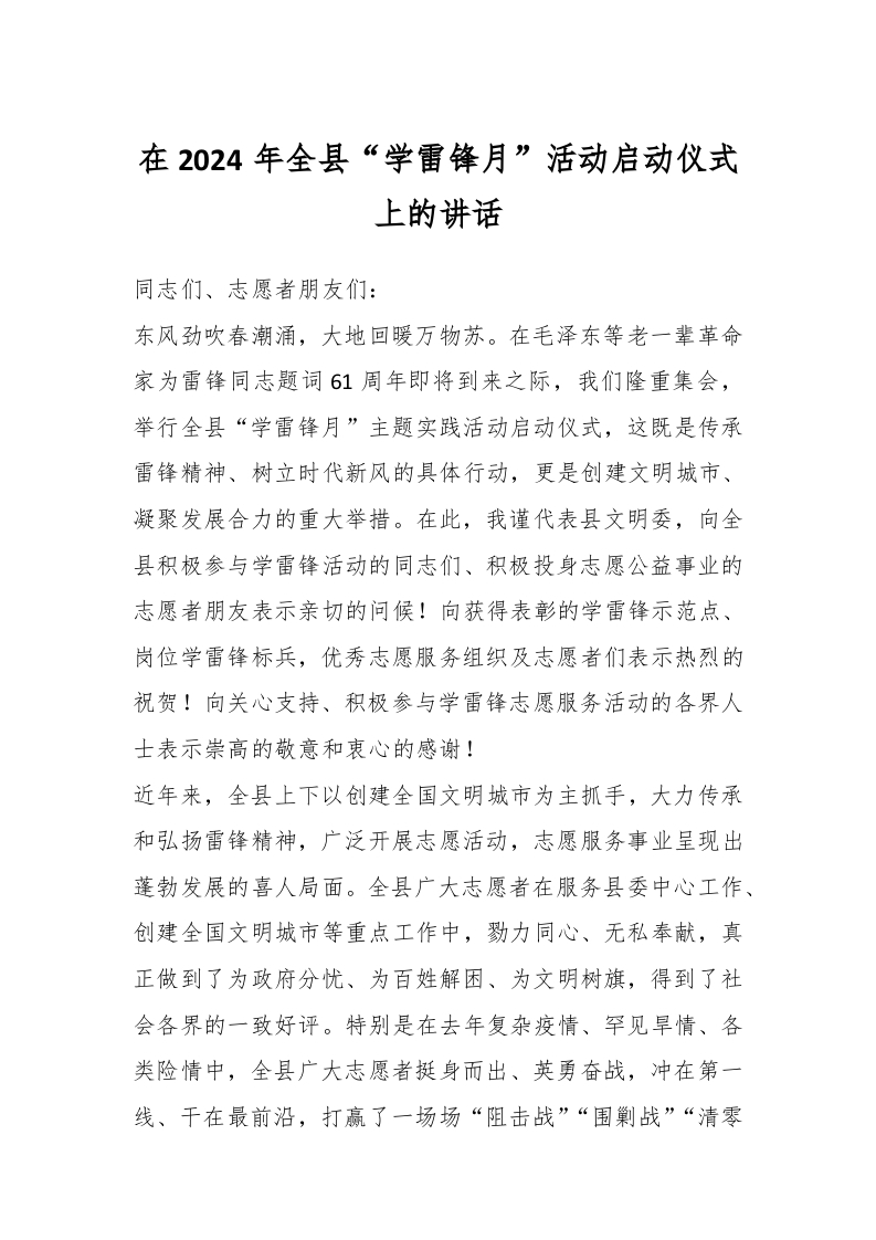 / 在2024年全县“学雷锋月”活动启动仪式上的讲话稿