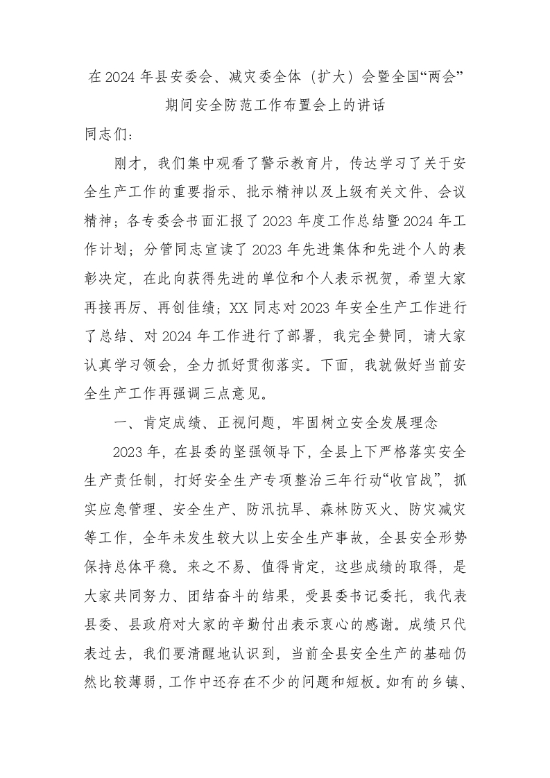 / 在2024年县安委会、减灾委全体(扩大)会暨全国“两会”期间安全防范工作布置会上的讲话