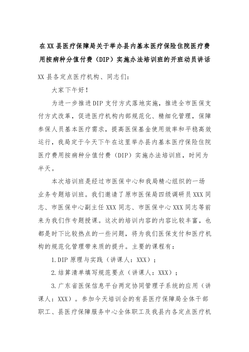 / 在XX县医疗保障局关于举办县内基本医疗保险住院医疗费用按病种分值付费(DIP)实施办法培训班的开班动员讲话稿