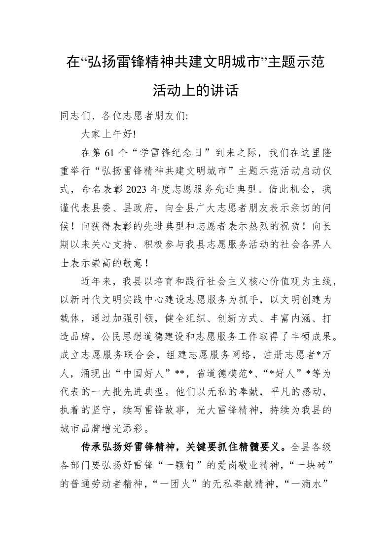 在“弘扬雷锋精神 共建文明城市”主题示范活动上的讲话