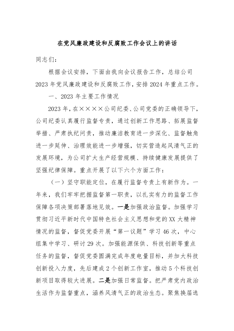 / 在党风廉政建设和反腐败工作会议上的讲话稿
