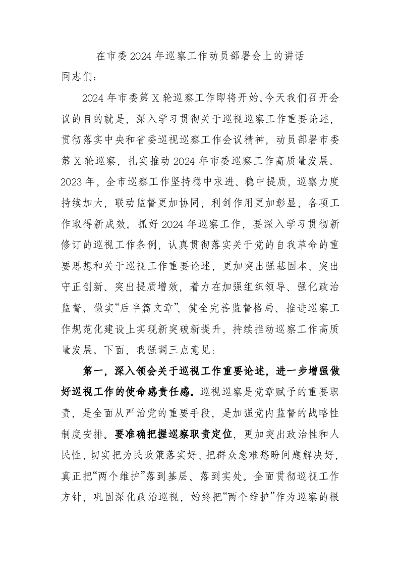/ 在市委2024年巡察工作动员部署会上的讲话