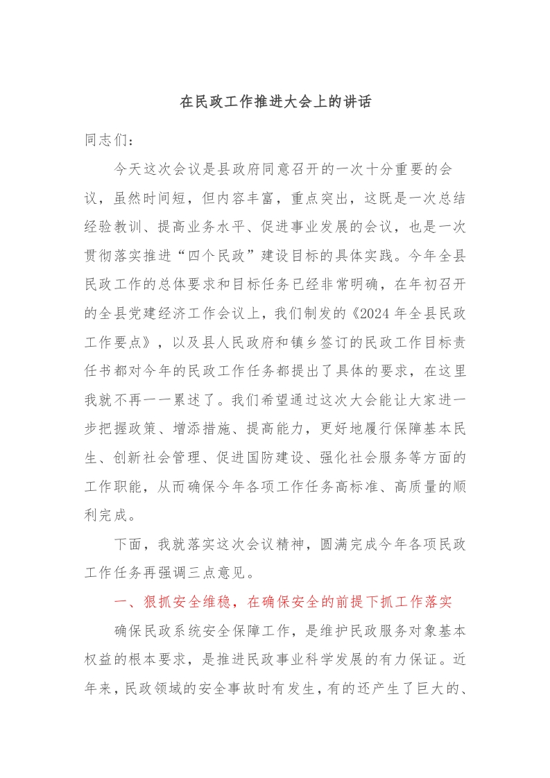 / 在民政工作推进大会上的讲话稿