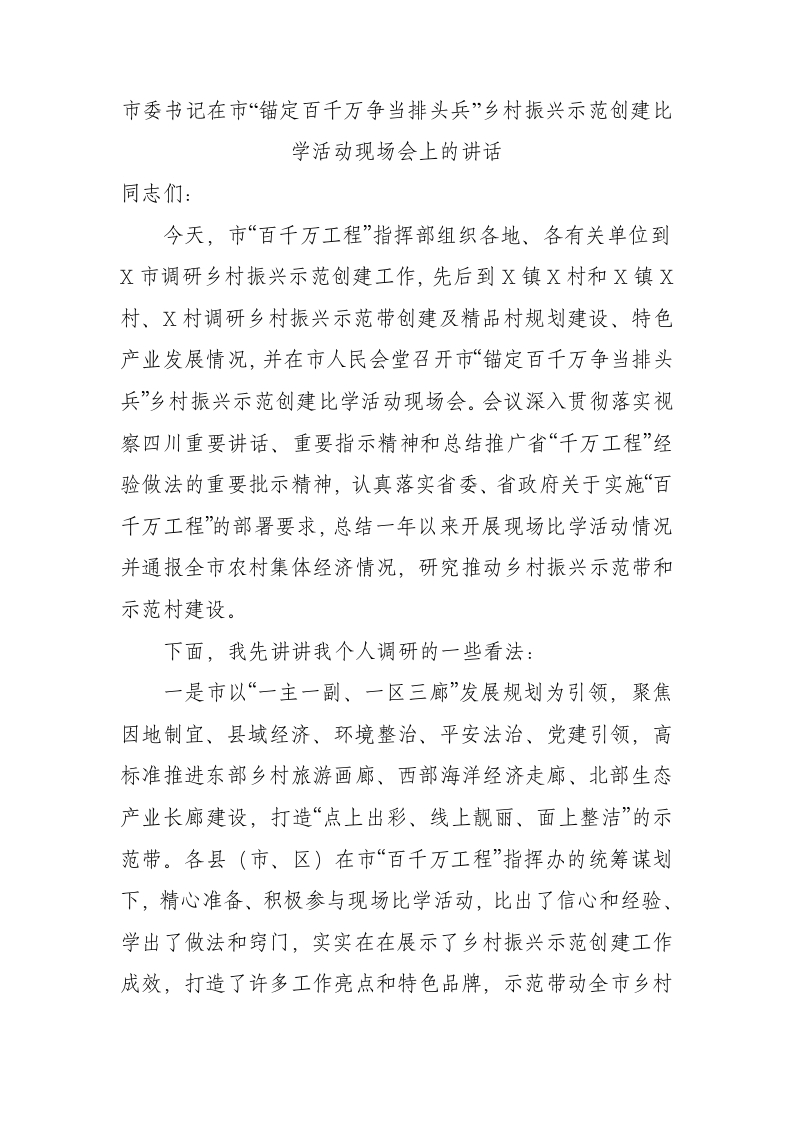 / 市委书记在市“锚定百千万争当排头兵”乡村振兴示范创建比学活动现场会上的讲话