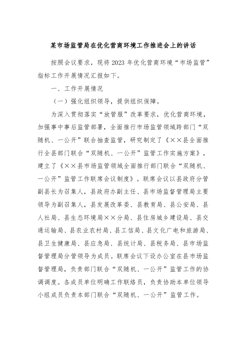 / 某市场监管局在优化营商环境工作推进会上的讲话稿