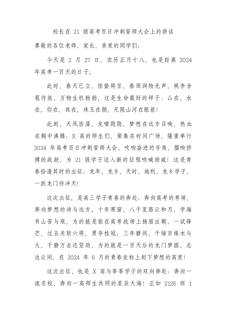 / 校长在21级高考百日冲刺誓师大会上的讲话(学校)