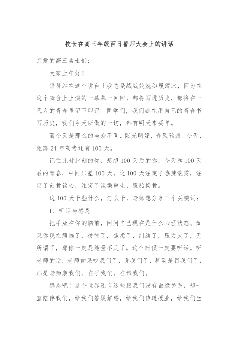 / 校长在高三年级百日誓师大会上的讲话稿
