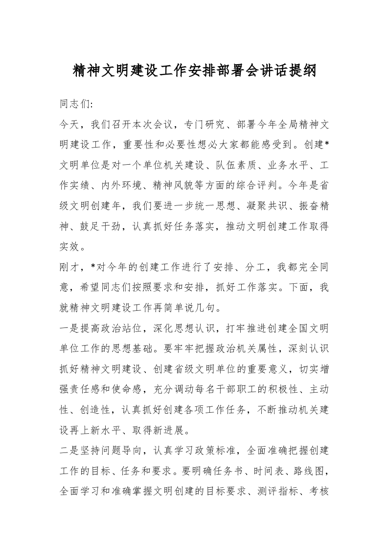 / 精神文明建设工作安排部署会讲话稿提纲
