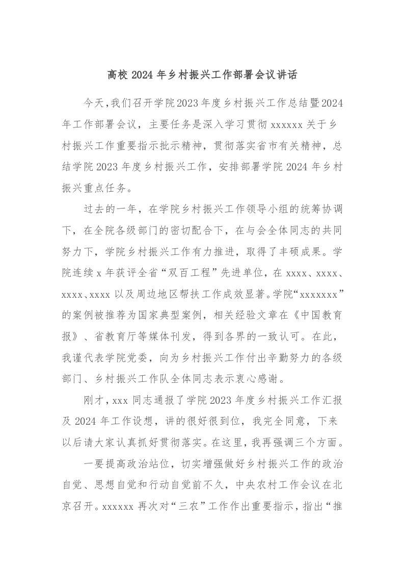 / 高校2024年乡村振兴工作部署会议讲话稿