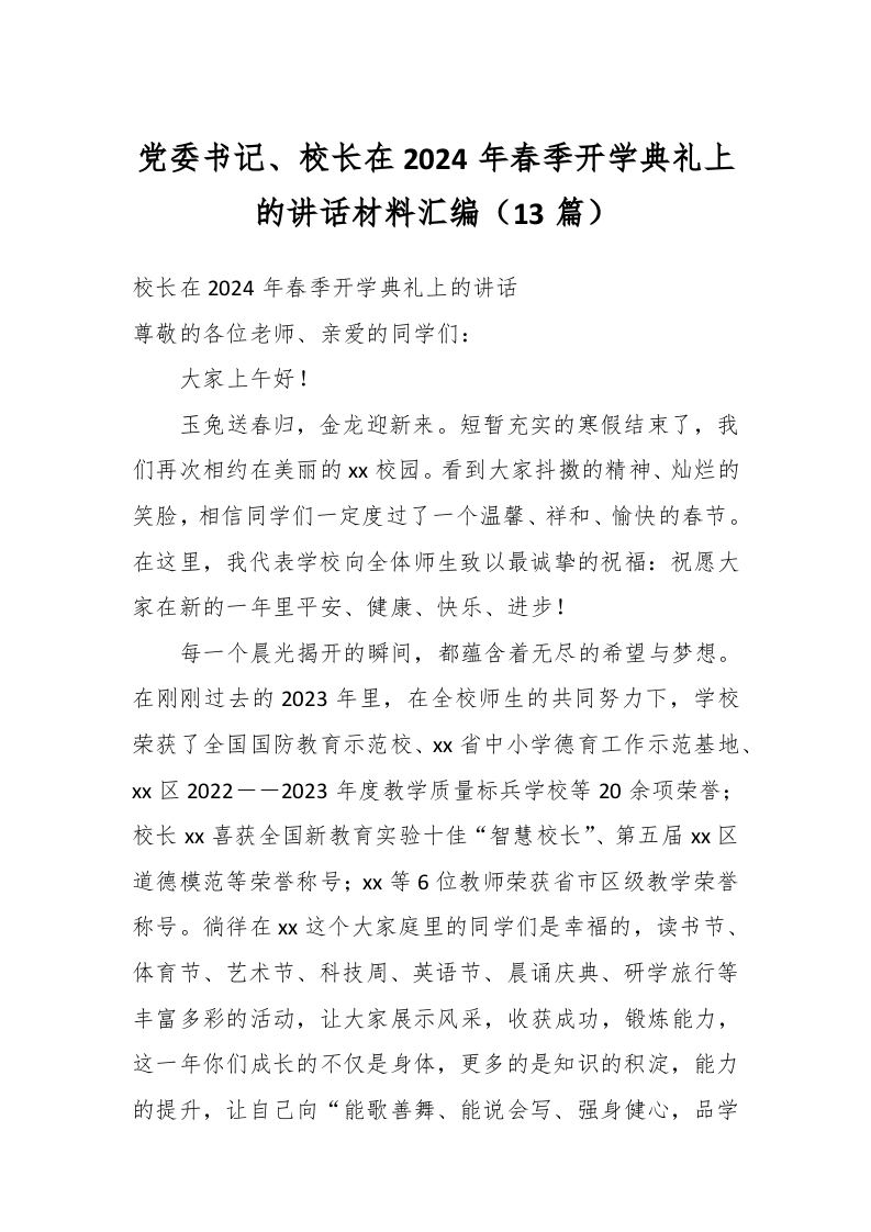 / (13篇)党委书记、校长在2024年春季开学典礼上的讲话稿材料汇编