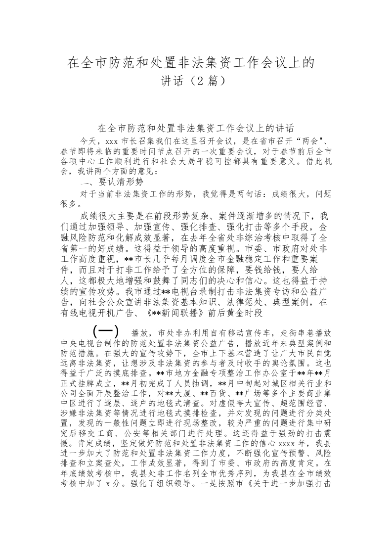 / (2篇)在全市防范和处置非法集资工作会议上的讲话稿