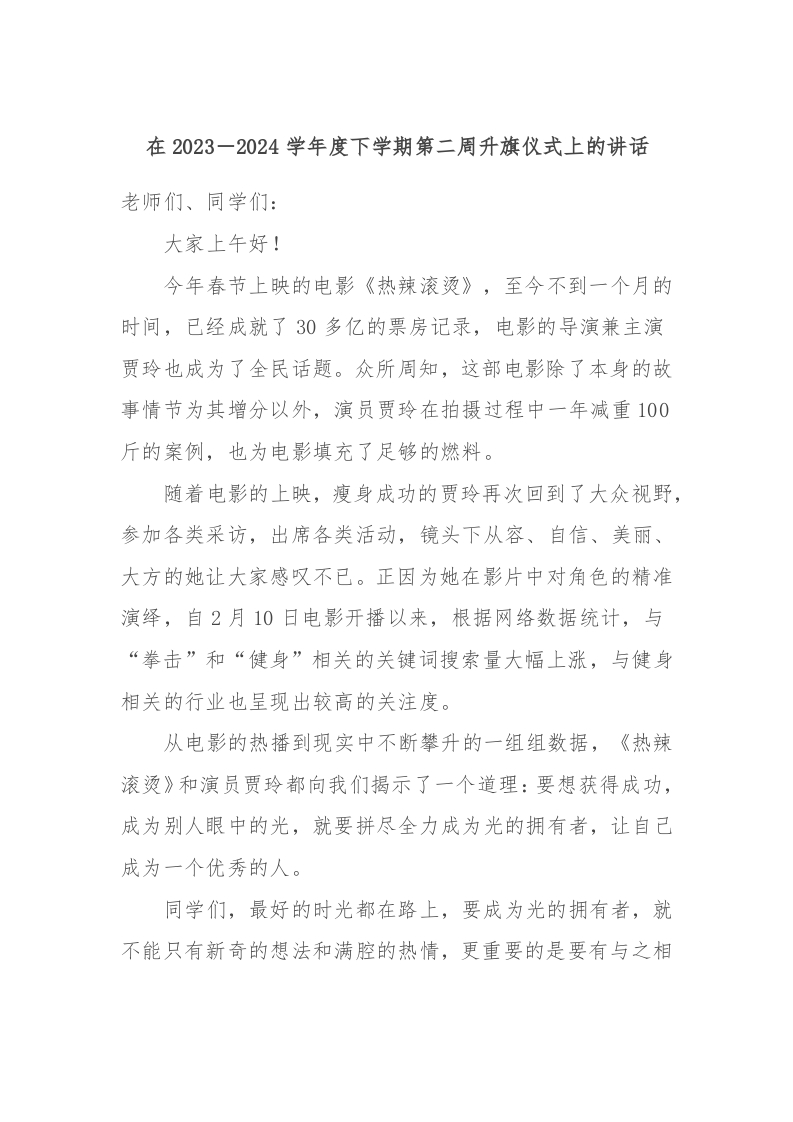 / 在2023-2024学年度下学期第二周升旗仪式上的讲话稿