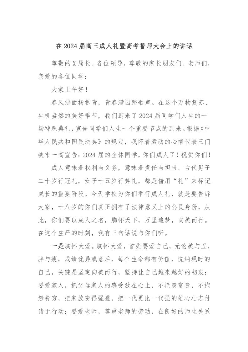 / 在2024届高三成人礼暨高考誓师大会上的讲话稿