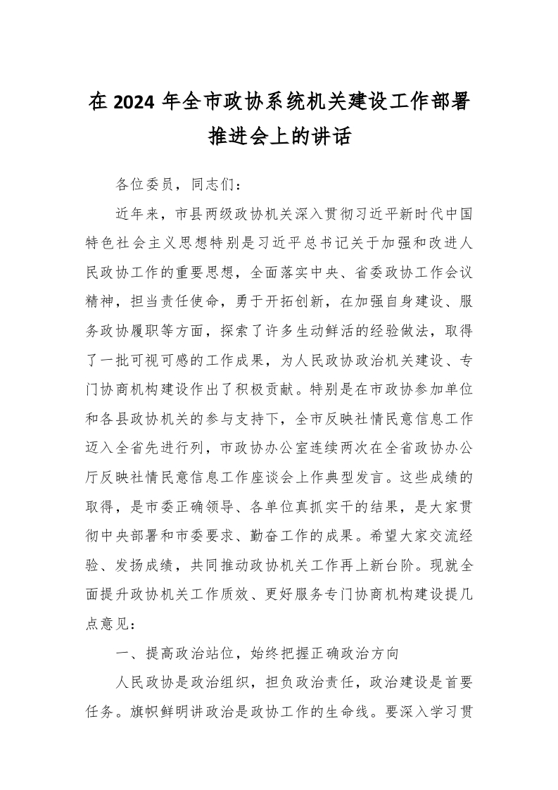 / 在2024年全市政协系统机关建设工作部署推进会上的讲话稿