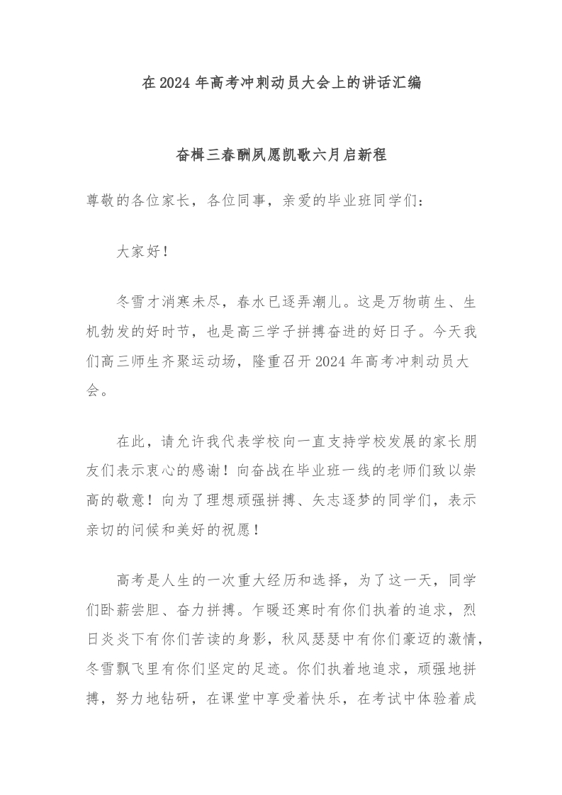 / 在2024年高考冲刺动员大会上的讲话稿汇编