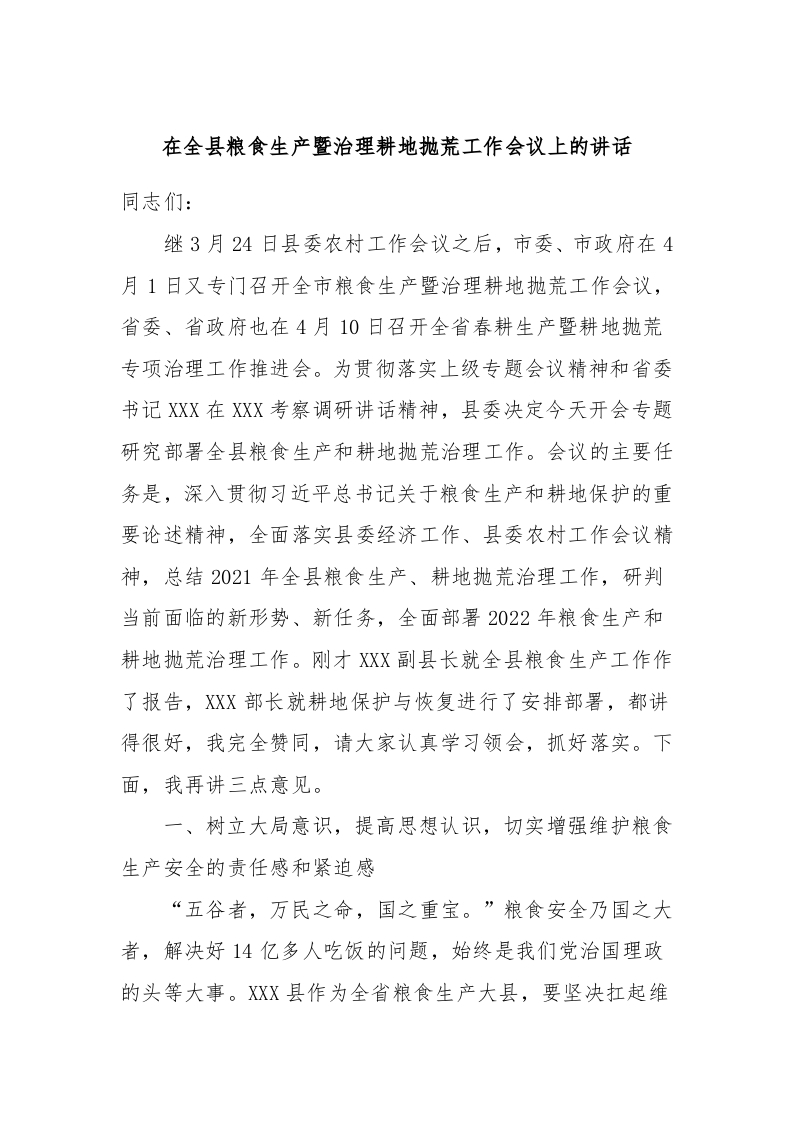 / 在全县粮食生产暨治理耕地抛荒工作会议上的讲话稿