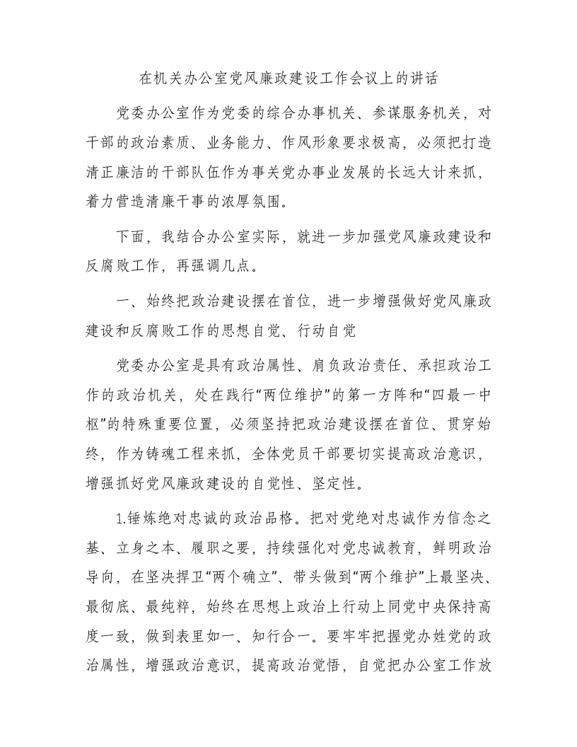 在机关办公室党风廉政建设工作会议上的讲话稿