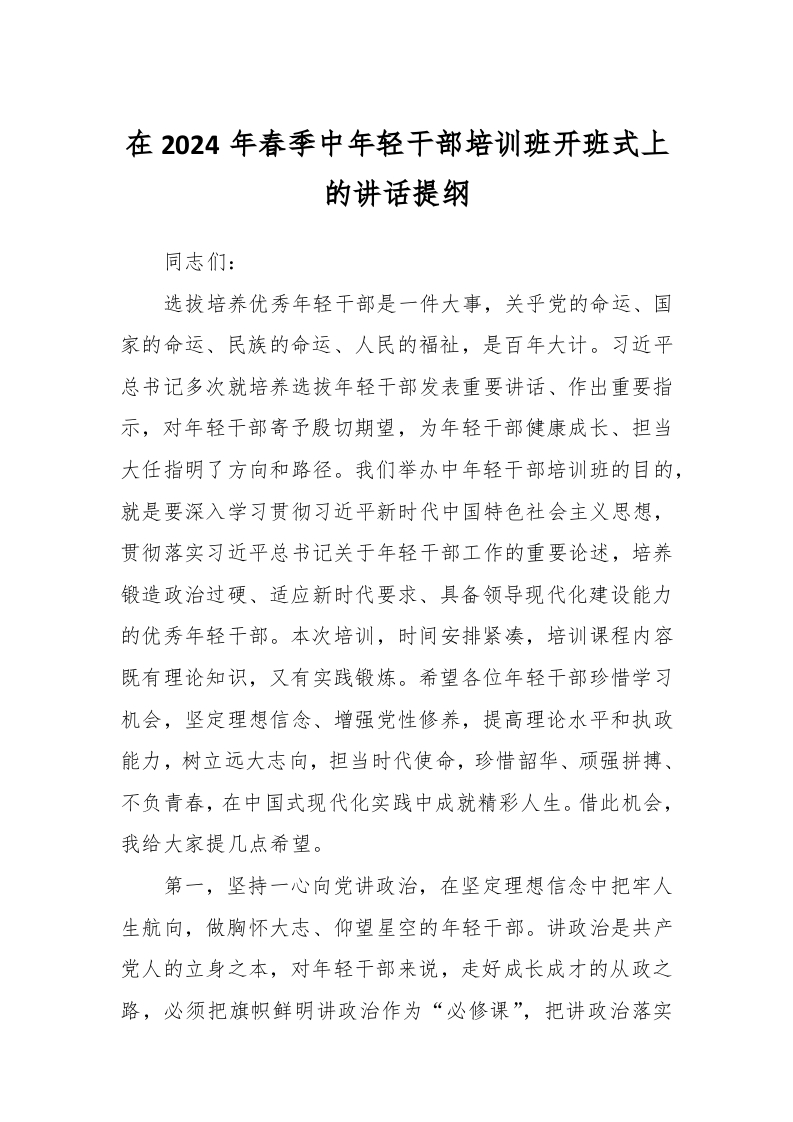 / 在2024年春季中年轻干部培训班开班式上的讲话稿提纲