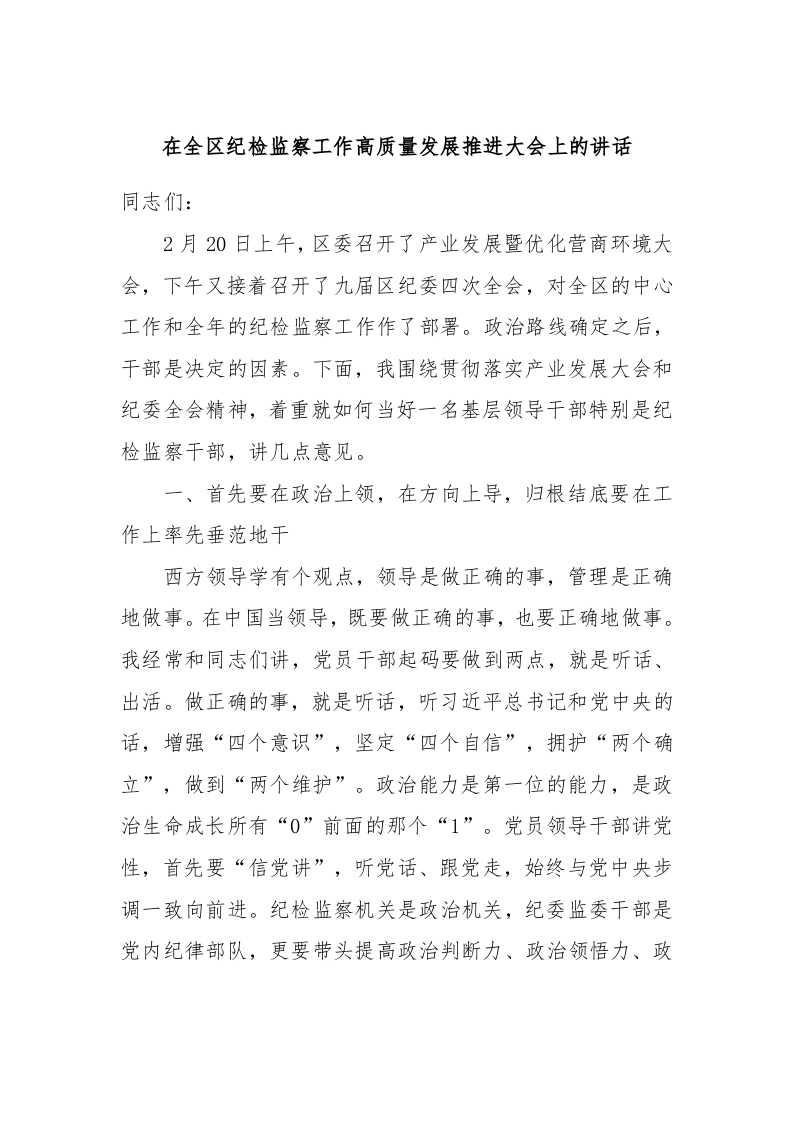 / 在全区纪检监察工作高质量发展推进大会上的讲话稿