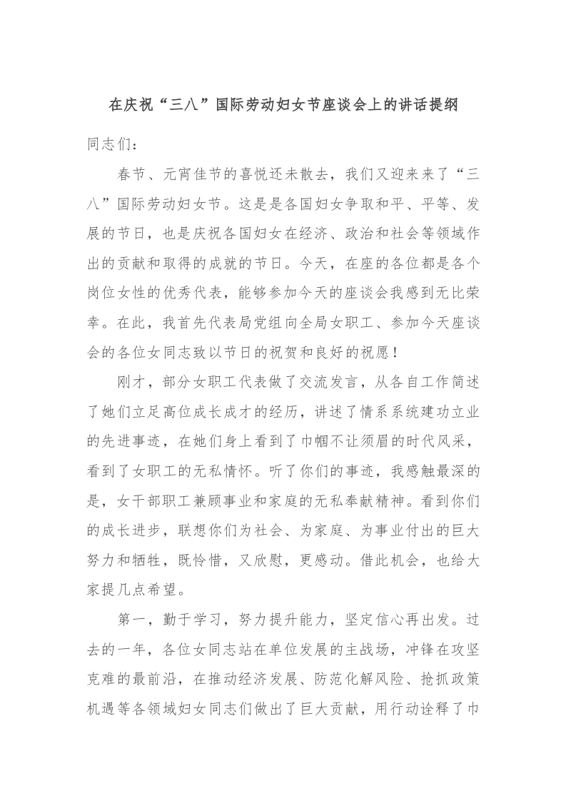 / 在庆祝“三八”国际劳动妇女节座谈会上的讲话稿提纲