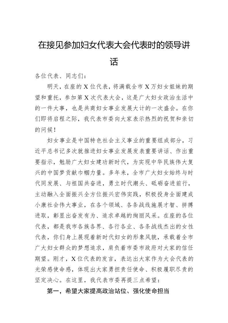 / 在接见参加妇女代表大会代表时的领导讲话稿