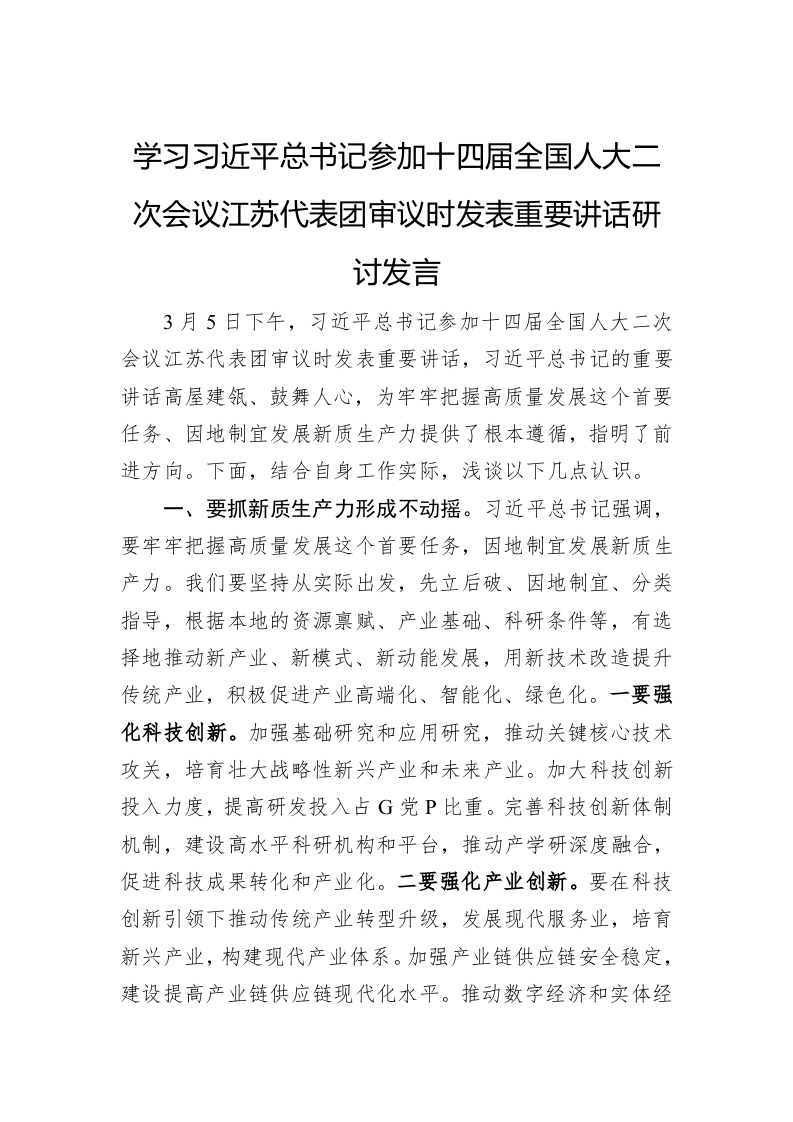 / 学习习近平总书记参加十四届全国人大二次会议江苏代表团审议时发表重要讲话稿研讨发言稿